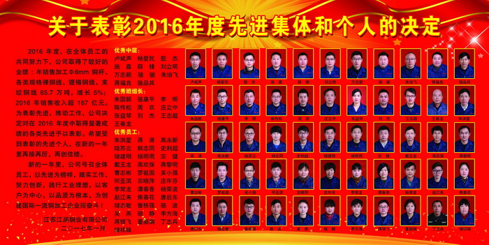 2016年度,在全體員工的共同努力下,公司取得了較好的業績:年銷售加工Φ8mm銅桿、各類規格裸銅線、鍍錫銅線、束絞銅線65.7萬噸,增長5%;2016年銷售收入超167億元。為表彰先進,推動工作,公司決定對在2016年度中取得顯著成績的各類先進予以表彰。希望受到表彰的先進個人,在新的一年里再接再厲,再創佳績。新的一年里,公司號召全體員工,以先進為榜樣,踏實工作、努力創新,踐行工業理想,以客戶為中心,以品質為根本,為創建國際一流銅加工企業而奮斗。優秀中層:盧斌聲、楊愛民、殷 杰、施嘉、薛鋒、劉立明 萬志新、駱駿、朱培飛、蔣福良、駱品其 優秀班組長:朱國新、駱康平、李 明、陳傳松、周 歡、莊立中 張益琴、劉 杰、王志超、王春龍 優秀員工:朱洪星、蔣濤、高永新、陸蘇云、韓志同、史利超儲建明、楊明雨、宗健、戴玉龍、 高歡保、蔣黎明曹志彬、羅祖國、吳小強、何亞濱、宗曉萍、莊年芬李常龍、譚春香、楊榮波、趙江來、焦春花、唐后東 儲志敏、曾棟強、駱 波、吳燕、駱 靜、李方海 蔣銀飛、董麗娟、丁志兵、儲祥妹